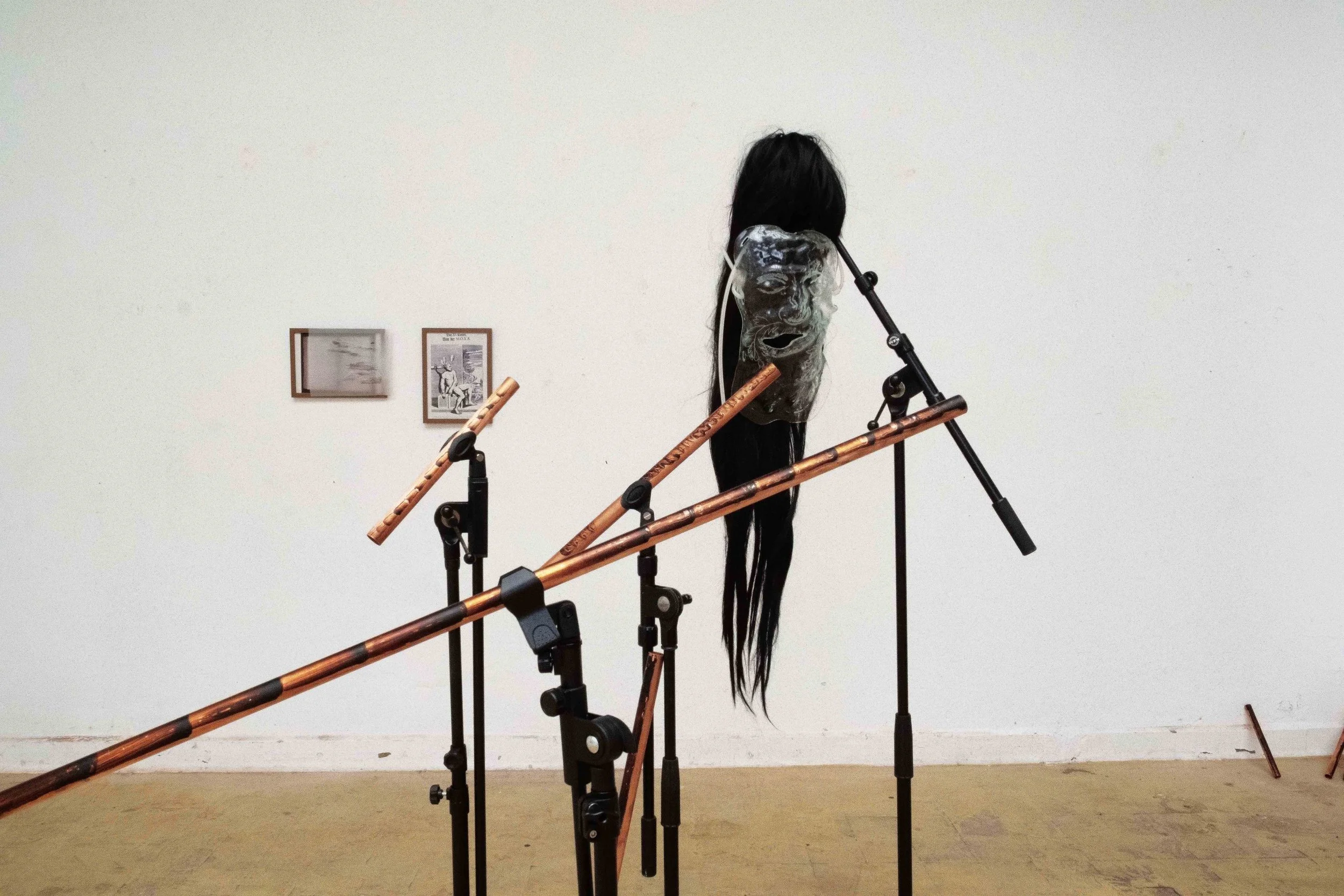 The work explores the embodied language as the new form of knowledge and site of resistance towards translation within colonial power, staying drifting and opaque. The installation brings together a series of copperplate engravings, and performative glass masks. Copperplate engraving—historically used to disseminate anatomical images—appears here as a contested visual language. Rather than presenting the body as stable and knowable, the engravings fragment and drift, replacing authoritative anatomy with uncertainty and rupture. The glass masks, inspired by epileptic bodily states, extend this inquiry into embodied language: the body becomes a site where meaning flickers, breaks down, and resists translation.
